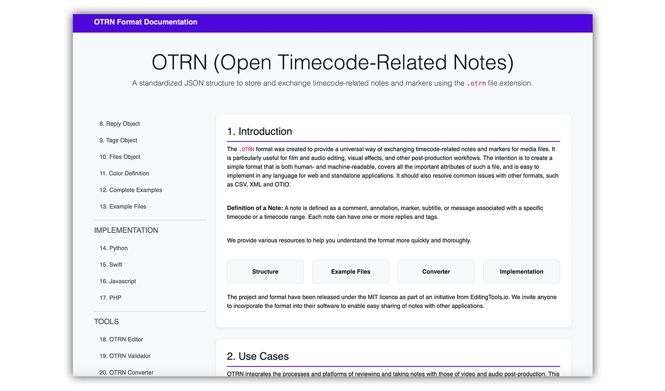 The .OTRN format was created to provide a universal way of exchanging timecode-related notes and markers for media files. It is particularly useful for film and audio editing, visual effects, and other post-production workflows. The intention is to create a simple format that is both human- and machine-readable, covers all the important attributes of such a file, and is easy to implement in any language for web and standalone applications. It should also resolve common issues with other formats, such as CSV, XML and OTIO.