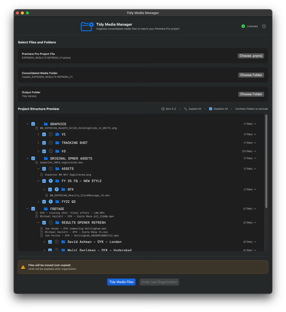 Tidy Media Manager reads your Premiere Pro project file and recreates the exact same folder structure on your hard drive, moving your media files into the correct locations.